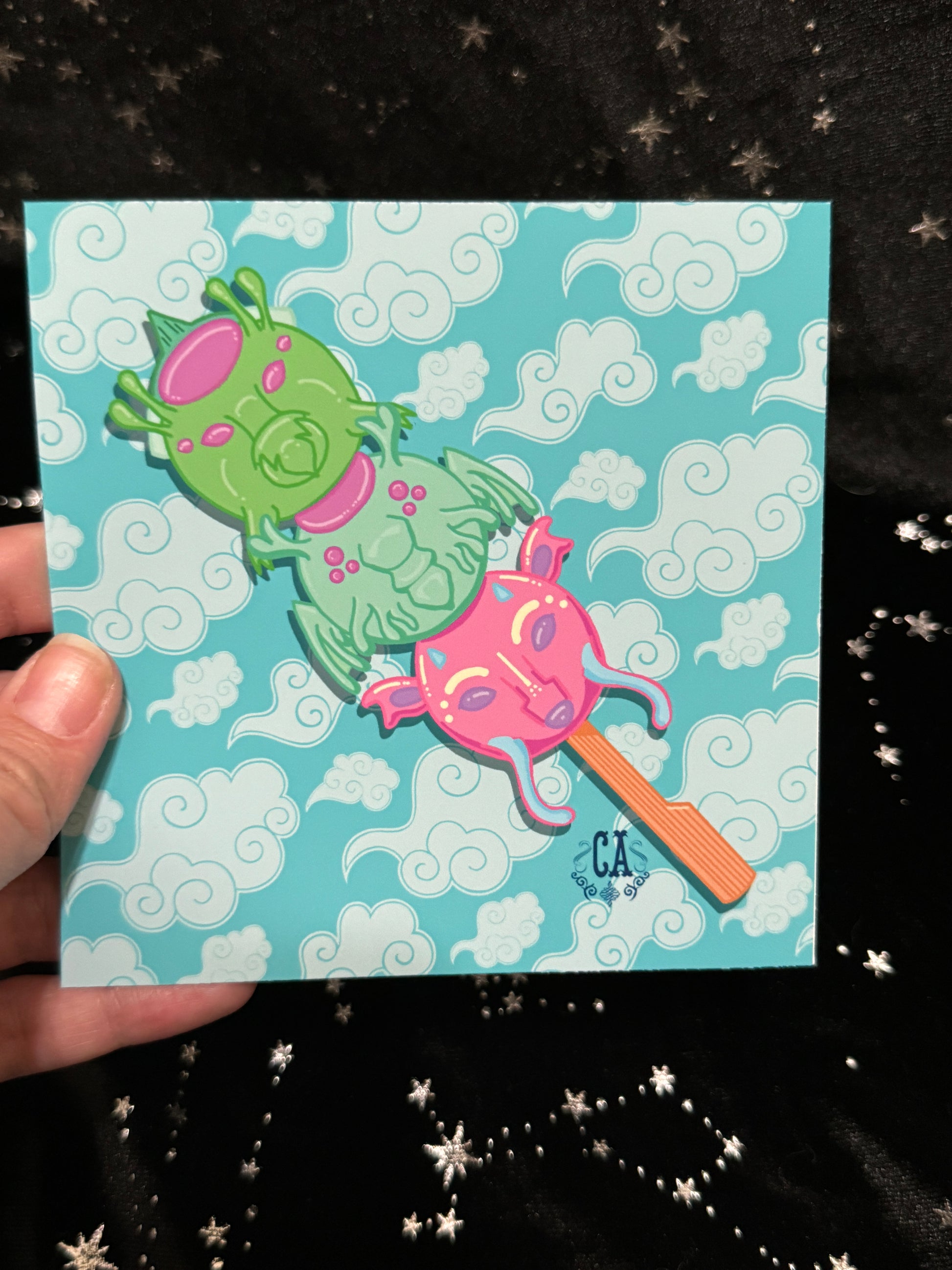 Delicious Hanami dango featuring various extraordinary extraterrestrials. 5”x5” print. Slight variation on size due to being printed and trim in house. Printed on semi-glossy photo paper.